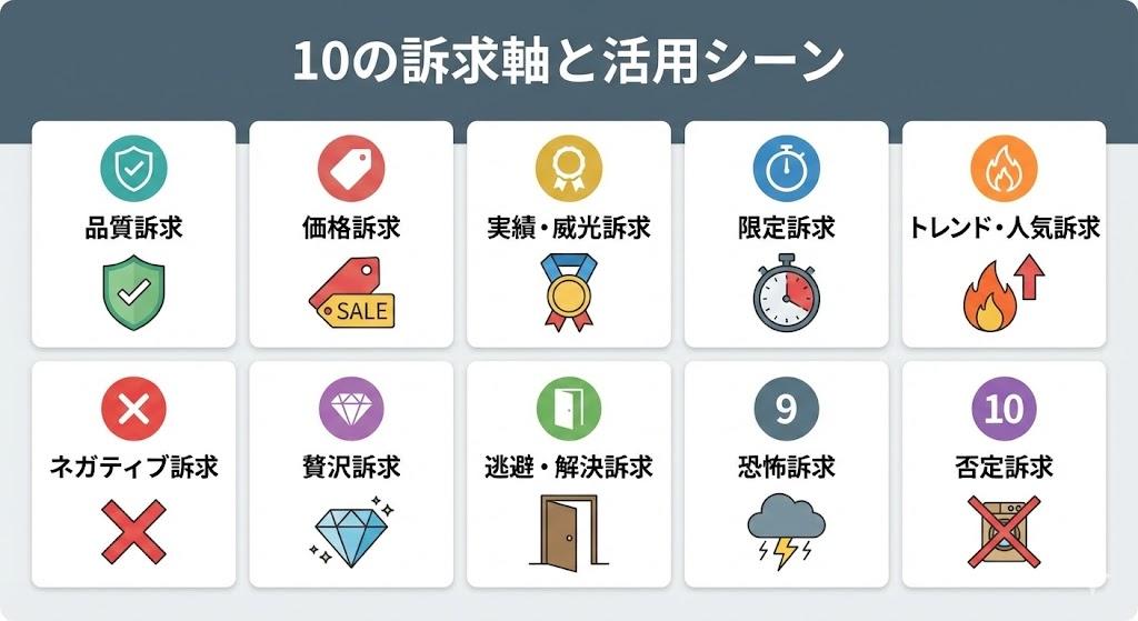 ターゲットの心理状態や製品の特性に合わせ、以下の10個の訴求軸を適切に使い分けましょう。