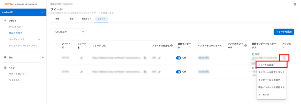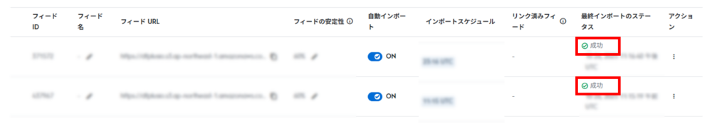 ⑥ 「最近行われたフィードのインポート」で、ステータスが「成功」になっているか確認