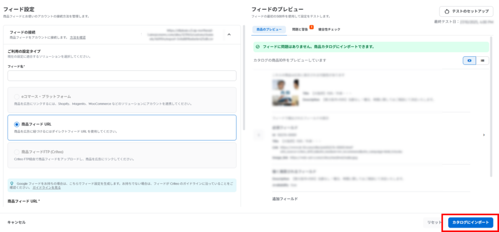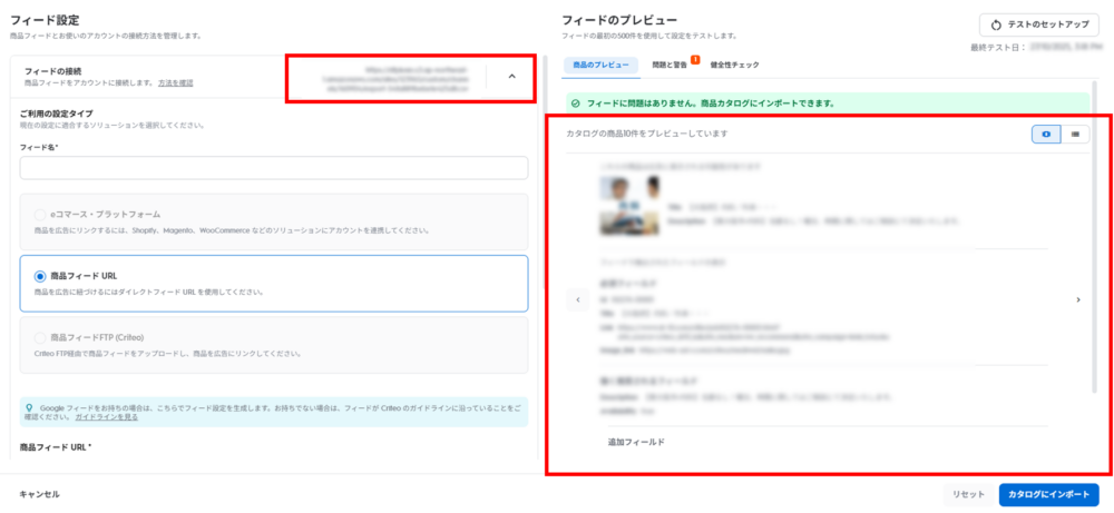 ③「フィードの接続」にあるURLを確認しプレビューを確認 ④  問題がなければ「カタログにインポート」をクリック