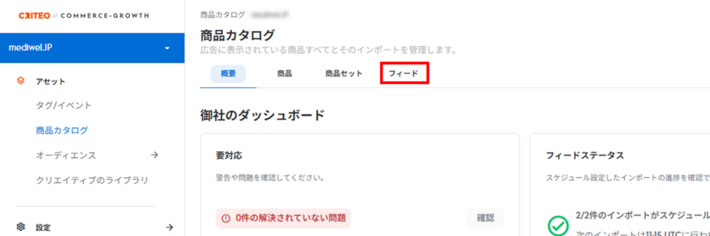 ※エラーがある場合は、下部に警告が表示されます。 ⑦  左メニューから「商品カタログ」→「最近行われたフィードのインポート」で成功を確認