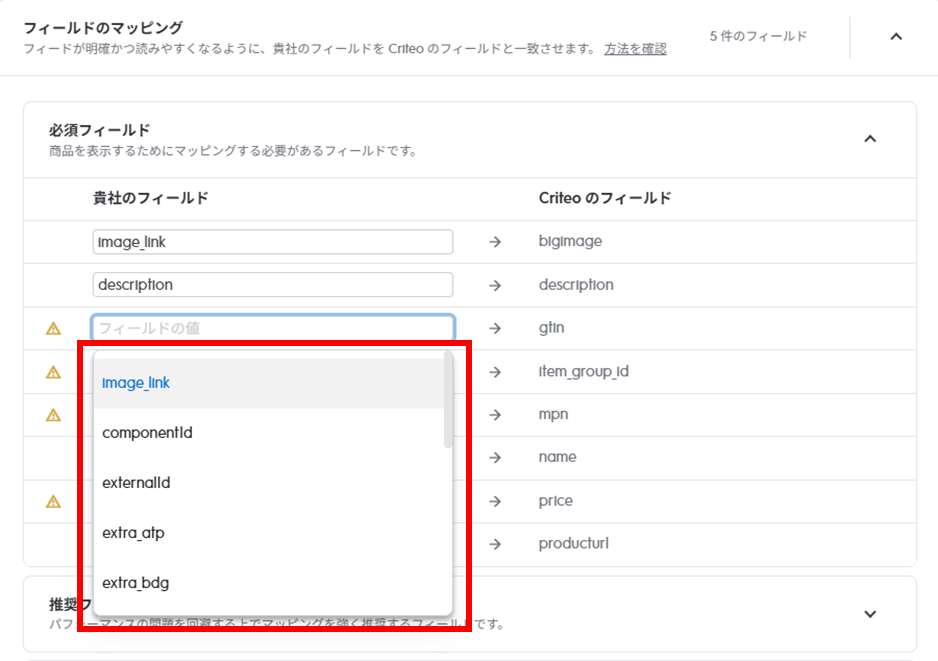 ※必須項目の欠落などがある場合、画面下部に黄色い警告が表示されます。その場合は、すぐにインポートせず、データ内容がCriteoの仕様に沿っているか再確認しましょう。 ⑤「カタログにインポート」後、左メニューから「商品カタログ」に戻る