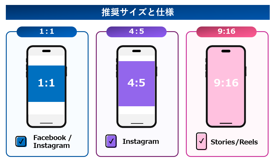 1:1(正方形) Facebook/Instagramフィード 汎用性が最も高く、基本となるサイズ(1080×1080px)