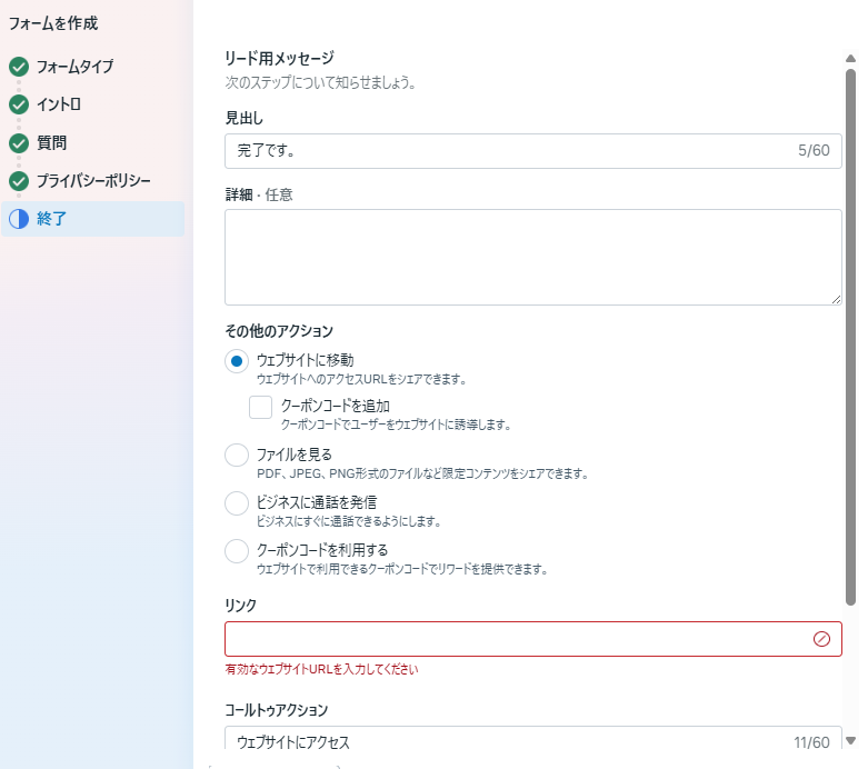 「リンク」よりフォームを送信してくれたユーザーを指定したウェブサイトへ誘導することも