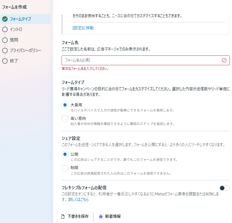 フレキシブルフォームの配信はデフォルトではOFFになっています。