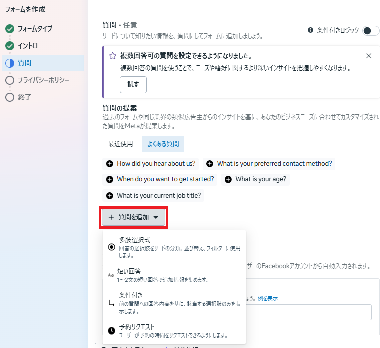 「+質問を追加」を選択し、質問形式を選びます。