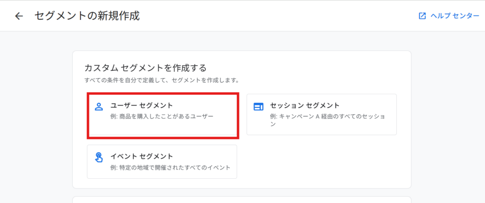 (今回はリピーターの動きを数値化して確認するため、「ユーザーセグメント」を選択します)