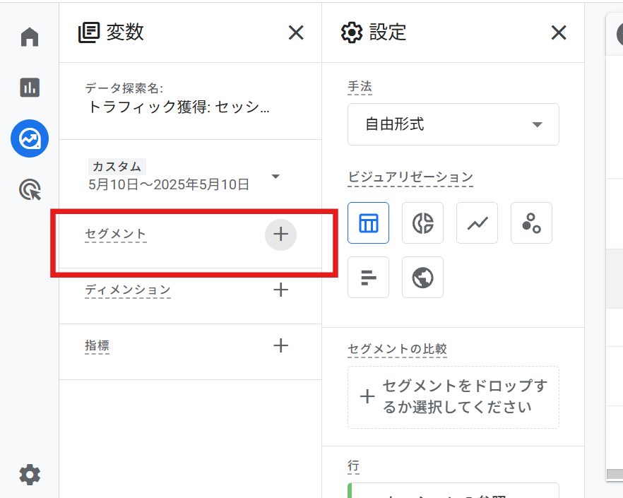 探索レポートの左側にある「セグメント」セクションから