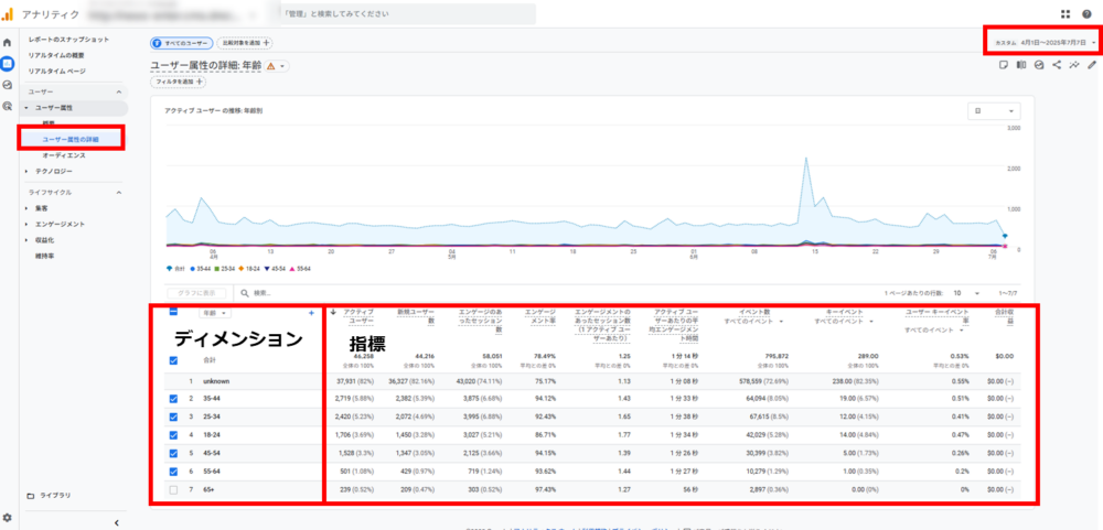 ⑤「ユーザー」→「ユーザー属性」→「年齢レポート」で