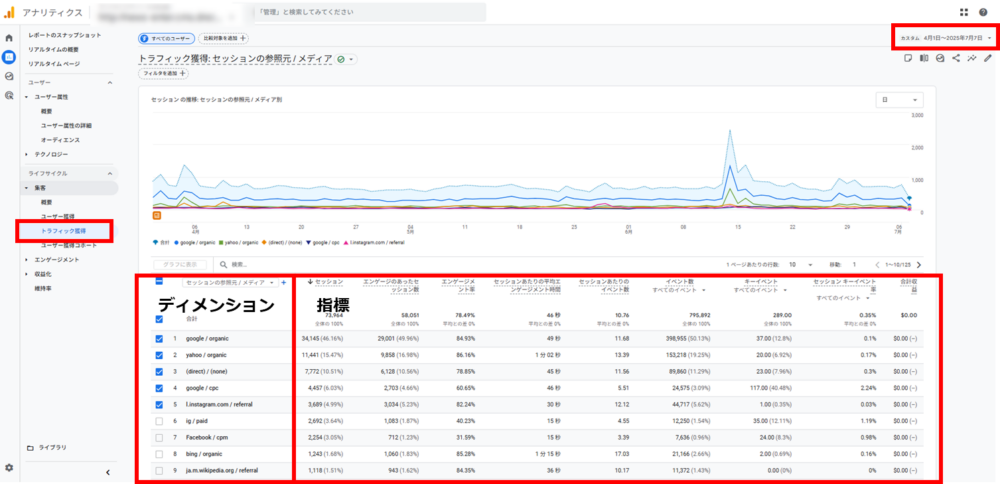 「集客 → すべてのトラフィック → 参照元 / メディア」