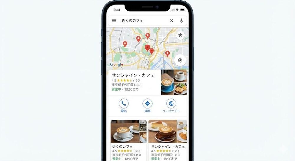 以下の画像は、スマートフォンで「近くのカフェ」と検索した際の表示例です。