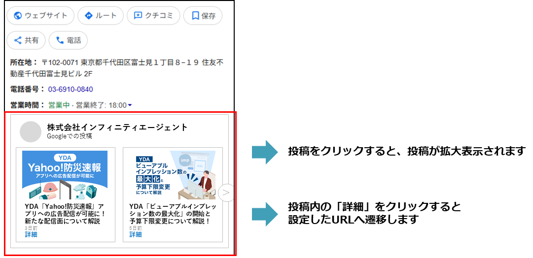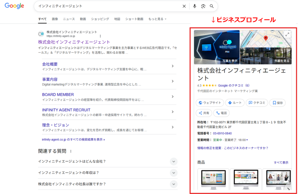 一番上の目立つ位置に、ビジネスプロフィールの情報が表示されているのが分かります。