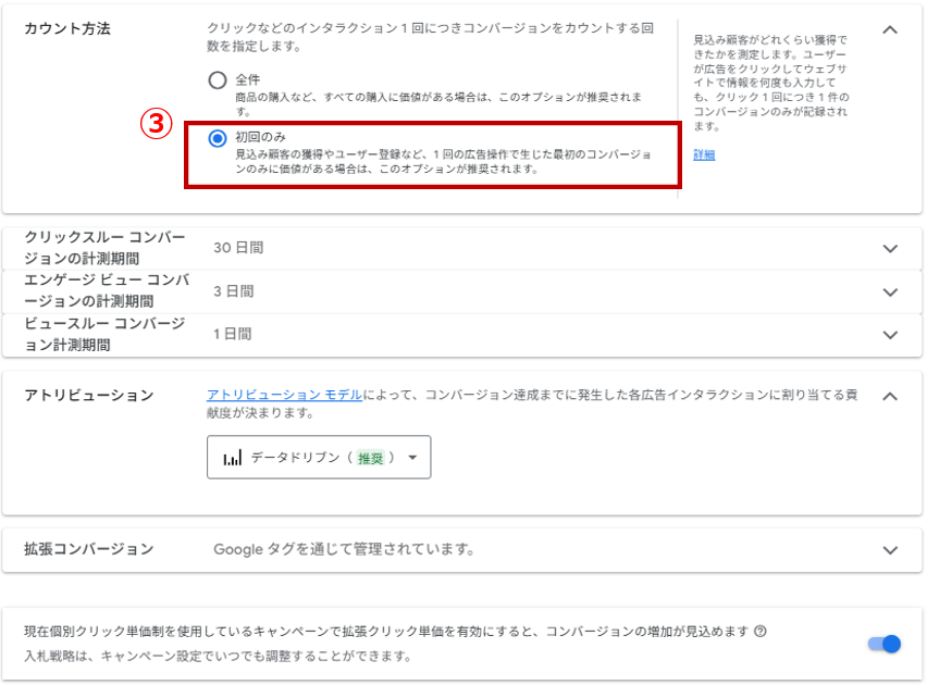 ③ カウント方法を初回のみに設定