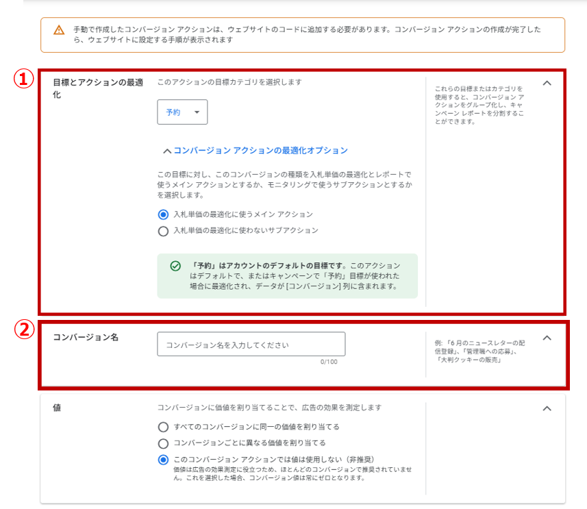 ① 目標とアクションの最適化を設定する