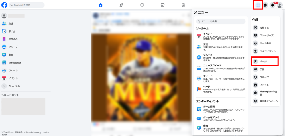 ③ 表示されるメニューから「作成」の配下にある「ページ」を選択
