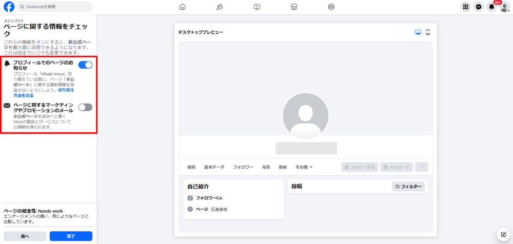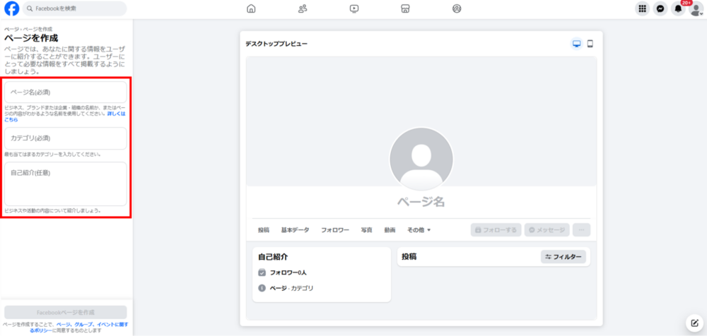 ⑤ 入力が完了したら「Facebookページを作成」ボタンをクリック