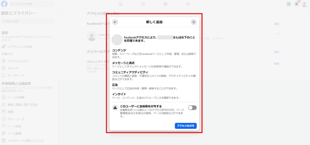 | アクセス許可 | 他のユーザーにアクセス権を付与・削除したり、 リンク済みのInstagramアカウントへのアクセスを管理できます |