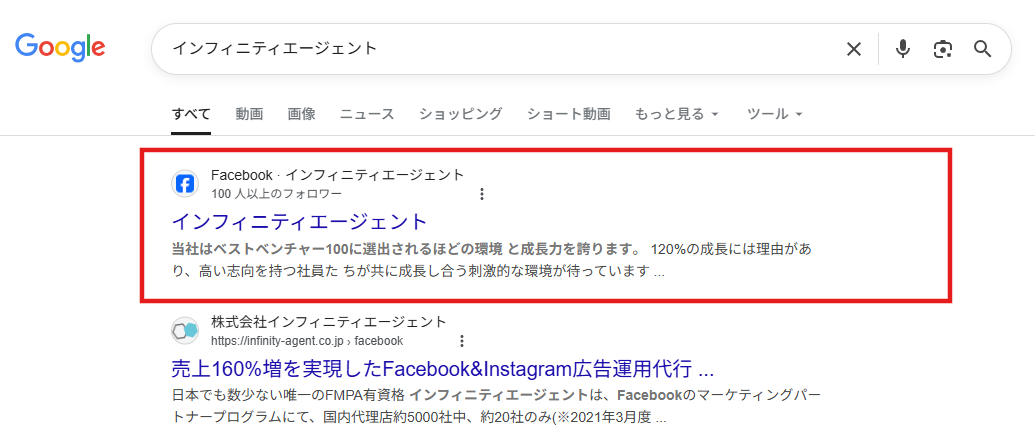 Facebookページの大きな利点の一つが、Google検索結果にも表示される点です。