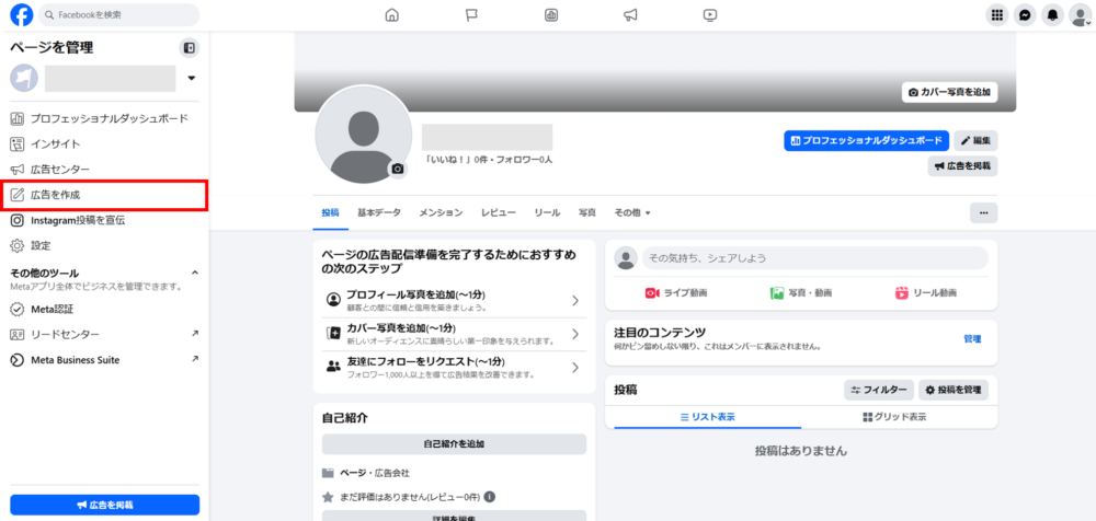 ページ画面左側のメニューから「広告を作成」をクリックし、広告の目標やクリエイティブ、日予算、配信期間、支払い方法などを設定して広告を開始できます。