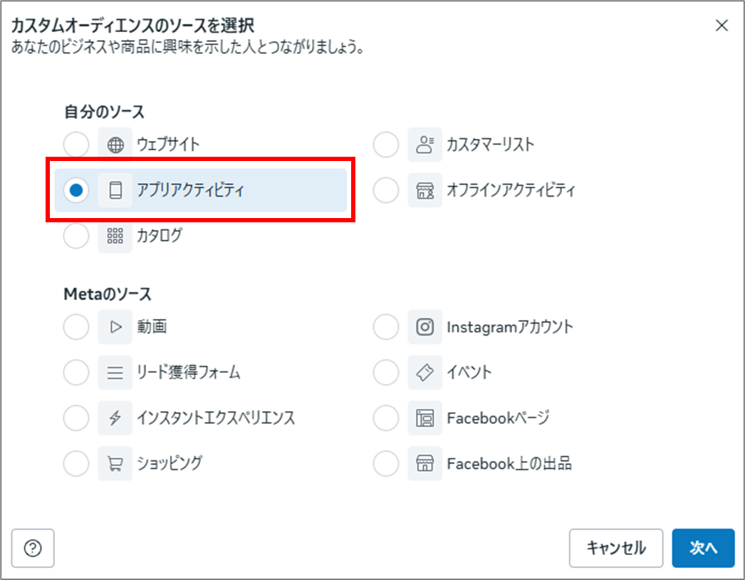 キャンペーン目的で「アプリの宣伝」を選択すると、