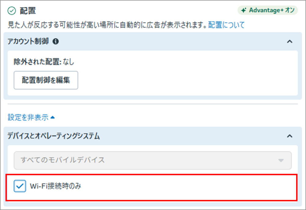 設定は、広告セットの「配置」内で「Wi-Fi接続時のみ」を選択するだけです。