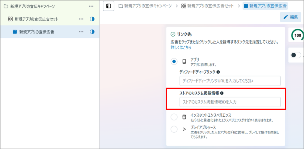 この機能は、広告の「アプリ」選択画面でカスタムページのIDを入力して設定します。
