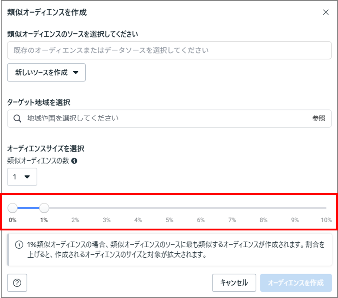 2〜3%、5%と段階的に拡張していくのがおすすめです。 ※画像引用(出典:Meta広告管理画面)