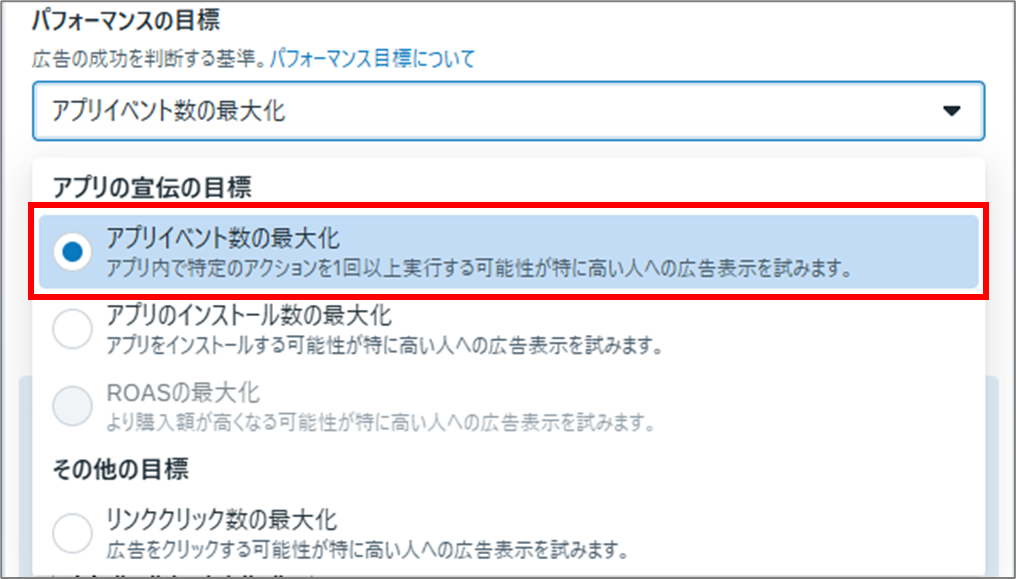 設定は、パフォーマンスの目標で「アプリイベント数の最大化」を選択するだけです。 ※画像引用(出典:Meta広告管理画面)
