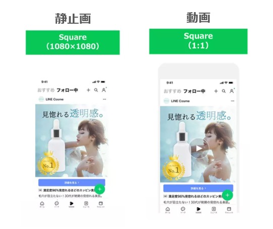 掲載面\フォーマット 静止画(1080 × 1080) 動画(1:1)