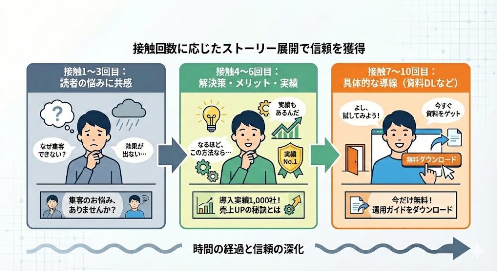 同じバナーを10回見せるのではなく、徐々に情報を深めていくことで、飽きを防ぎつつ信頼を高めます。
