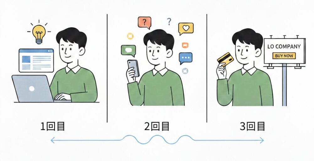 Web広告で1回、SNSで1回、看板広告で1回といったチャネルミックスで達成するのが、