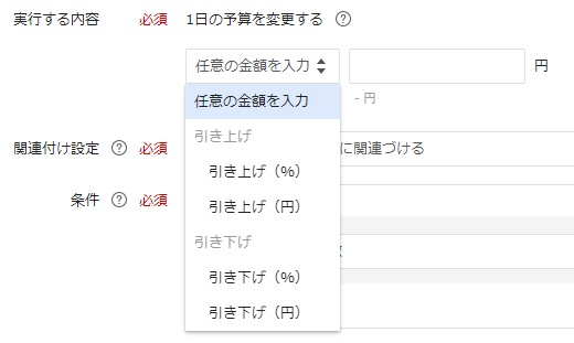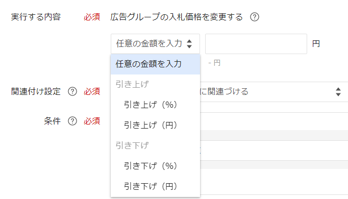 条件に一致したキーワードの入札価格を変更 以下から方法を選択し設定 任意の金額を入力/引き上げ/引き下げ ※上限値の設定も可能 |