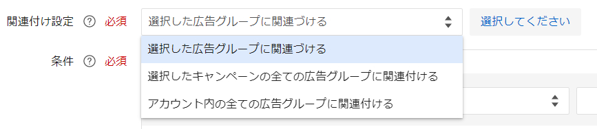 「アカウント内全てのキャンペーン(広告グループ)に関連付ける」を選択した場合、