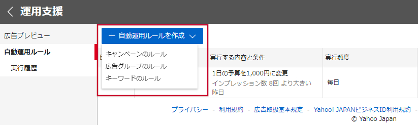 ※[3. 自動運用ルールの設定方法]での画像引用/参考(出典:Yahoo!広告ヘルプ)