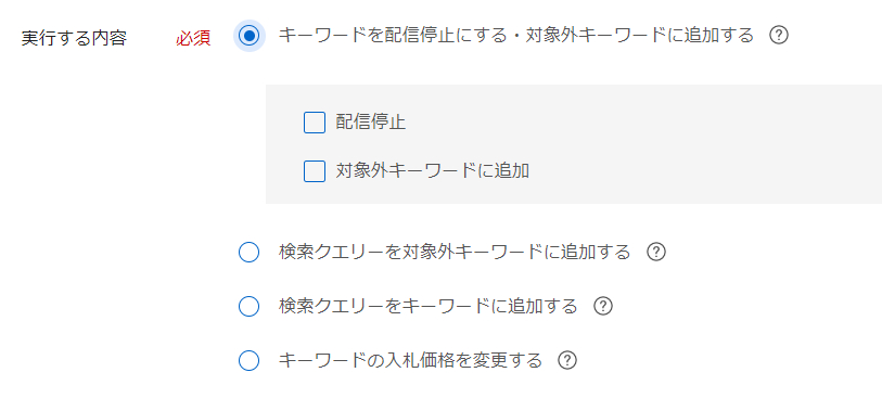 条件に一致したキーワードを停止 または、対象外キーワードに追加 |