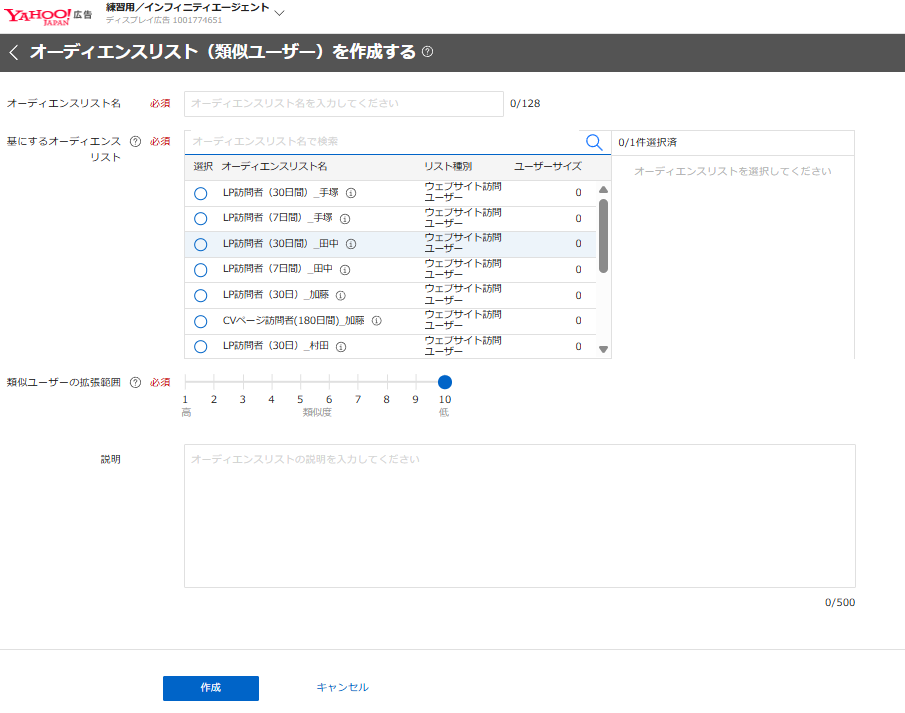 ⑦ 「類似ユーザーの拡張範囲」を設定→「作成」ボタンをクリック