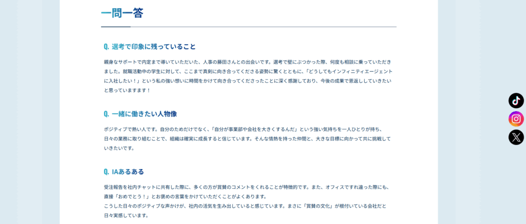 今回はメインとなるリニューアルポイントを3つご紹介しましたが、その他にも事業内容・職種紹介やよくある質問など、多様な情報が網羅されています。リクルートサイトを通して、少しでもインフィニティエージェントに興味をもっていただけたら嬉しいです!🩵