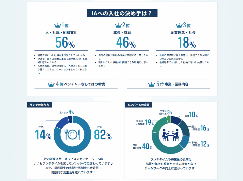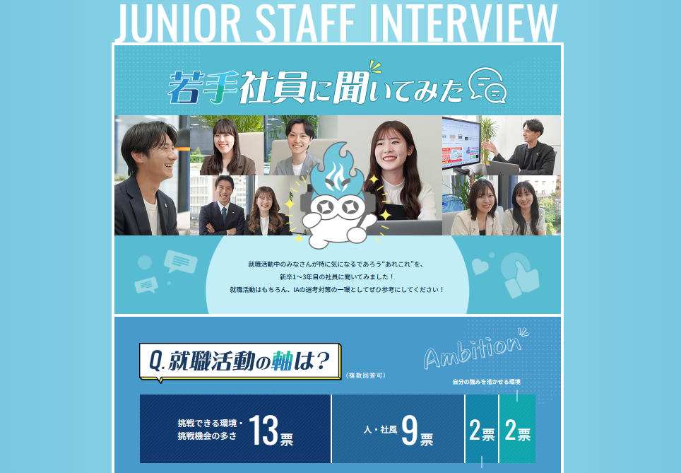 社員インタビューでは、年次・ポジション問わず、さまざまなメンバーの声を掲載しています。入社理由・実際に入社してどうだったか・今後の目標といったストーリーに加え、一問一答形式でIAあるあるやプライベートの過ごし方なども新たに追加しました!🌈🌈