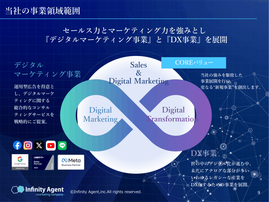 まず、当社の位置付けを明確にお伝えすると、インフィニティエージェントは、不動産・金融・人材業界を中心に、大手企業を含むクライアントと100%直取引を行うデジタルマーケティング会社です。