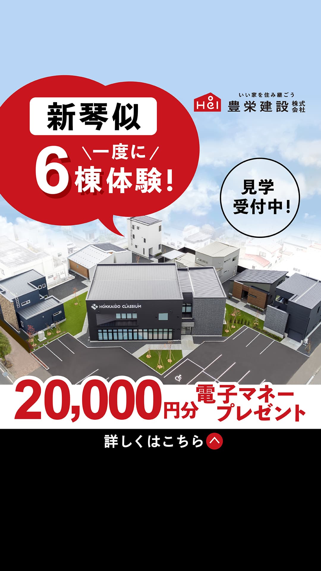 現地を上空から捉えた写真を使用することで、複数のモデルハウスが並ぶ「街並み」としてのスケール感を演出。 一箇所で効率よく見学できる利便性を直感的に伝えることができるデザイン。