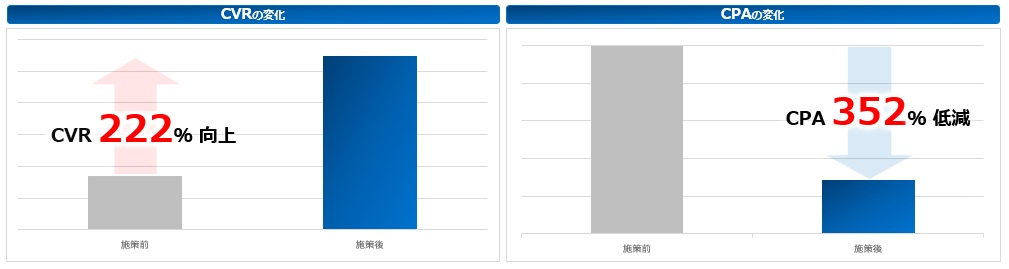 施策投下により、CVR(コンバージョン率)が222%向上し、獲得単価を352%改善することに成功しました。