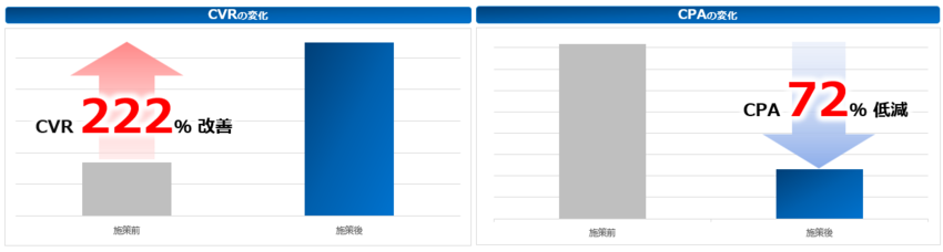 施策実施の結果、CVR(獲得率)が約222%改善しました。これに伴い、CPA(獲得単価)も約72%低減させることができました。