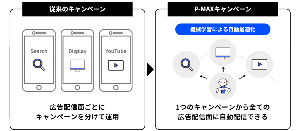 P-MAXキャンペーンとは、Googleのすべての広告枠に自動配信を行うキャンペーンタイプ(広告メニュー)です。