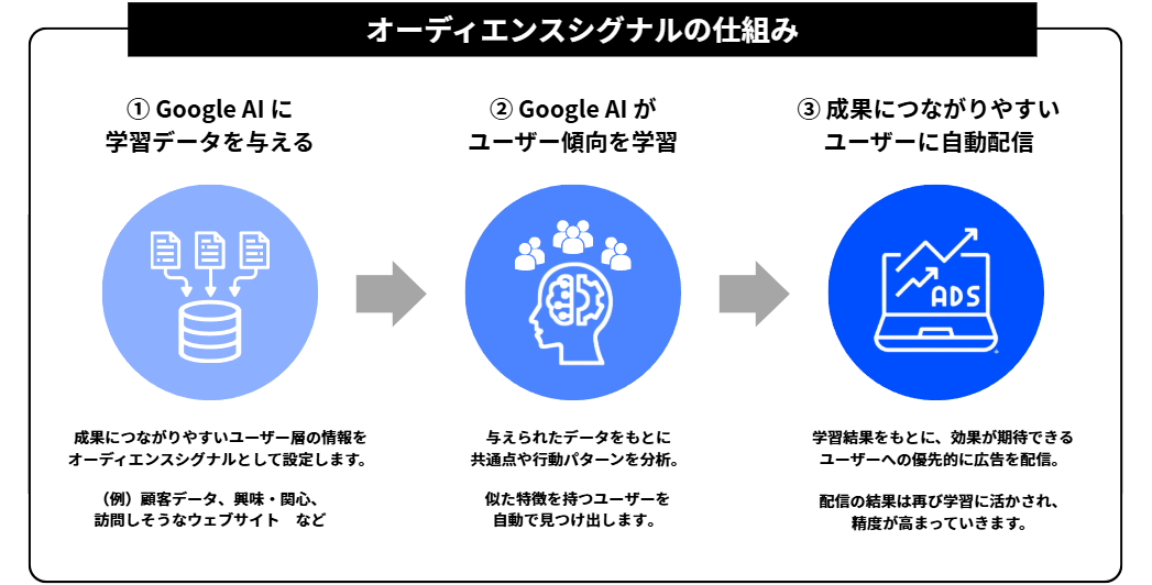 機械学習の精度を高める手段として、「オーディエンスシグナル」という機能があります。成果につながりやすいユーザー層の情報をGoogle AIに与えることで、配信の最適化を促進します。