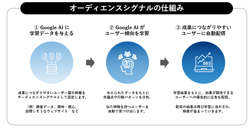 機械学習の精度を高める手段として、「オーディエンスシグナル」という機能があります。成果につながりやすいユーザー層の情報をGoogle AIに与えることで、配信の最適化を促進します。