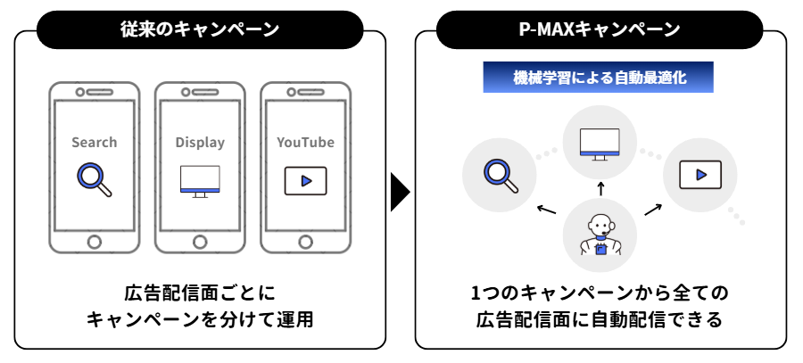 P-MAXキャンペーンとは、Googleのすべての広告枠に自動配信を行うキャンペーンタイプ(広告メニュー)です。