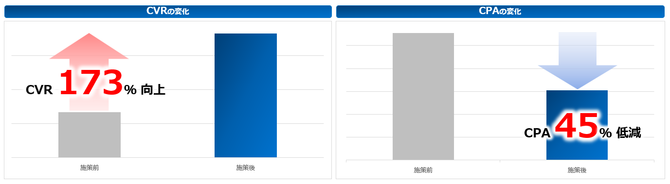 本事例では、P-MAXのオーディエンスシグナルにGA4のデータを活用することで、自動化メニューでありながら運用調整の難しいP-MAXにおいて成果改善(CVR:約173%改善、CPA:約45%低減)を実現することができました。