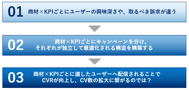 そこで今回は、「商材×KPIごとにキャンペーンを分割することで、学習速度と精度が向上するのではないか」という仮説を立てました。