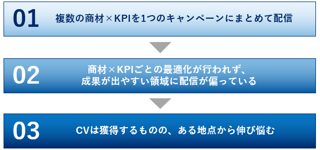 機械学習を促進する目的から、ASCでは全て一つのキャンペーンにまとめて配信していましたが、獲得自体は安定しているものの、さらなる申し込み数の拡大が課題となっていました。