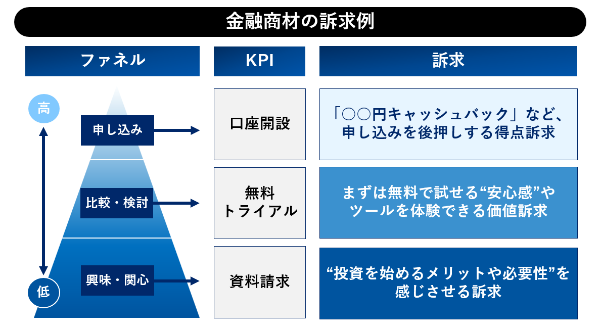特に、商材やKPIなど訴求軸が複数ある場合は、キャンペーンを分けて学習環境を整える必要があります。今回は金融商材でしたが、以下のような場面にも転用できます。