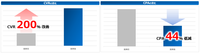 その結果、CPC(クリック単価)は一時的に高騰したものの、CVR(獲得率)が約200%改善。最終的に、CPA(獲得単価)を半分に抑えつつ、同額の広告費で対象ユーザーからの電話数を倍増させることに成功しました。表面的な指標だけでなく、事業成果に直結する指標に最適化することの重要性を示した事例です。